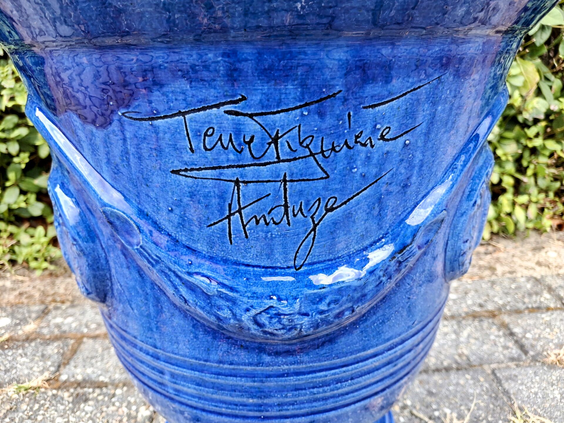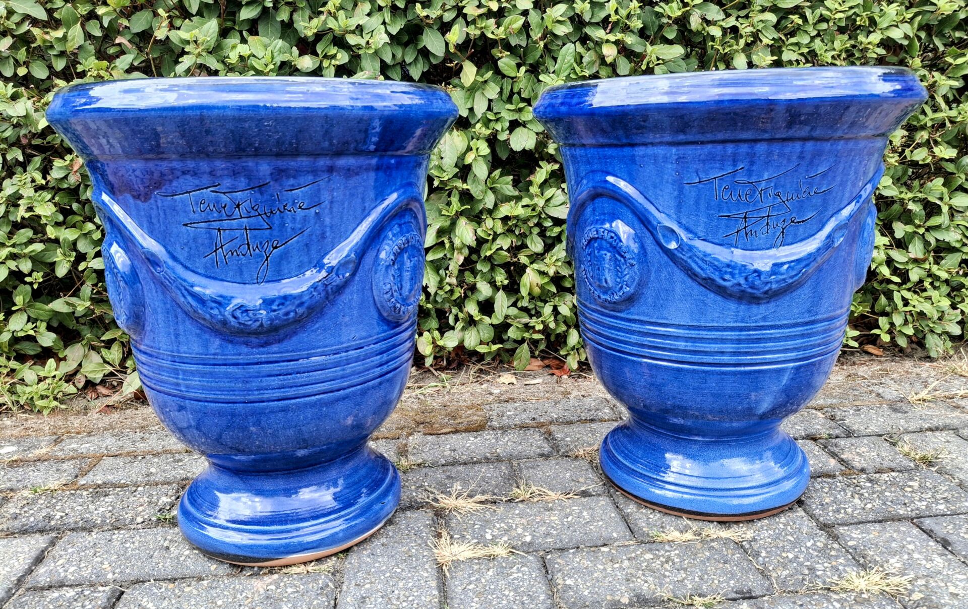 De originele geglazuurde anduze pot delta bleu Frankrijk 47 cm hoog.