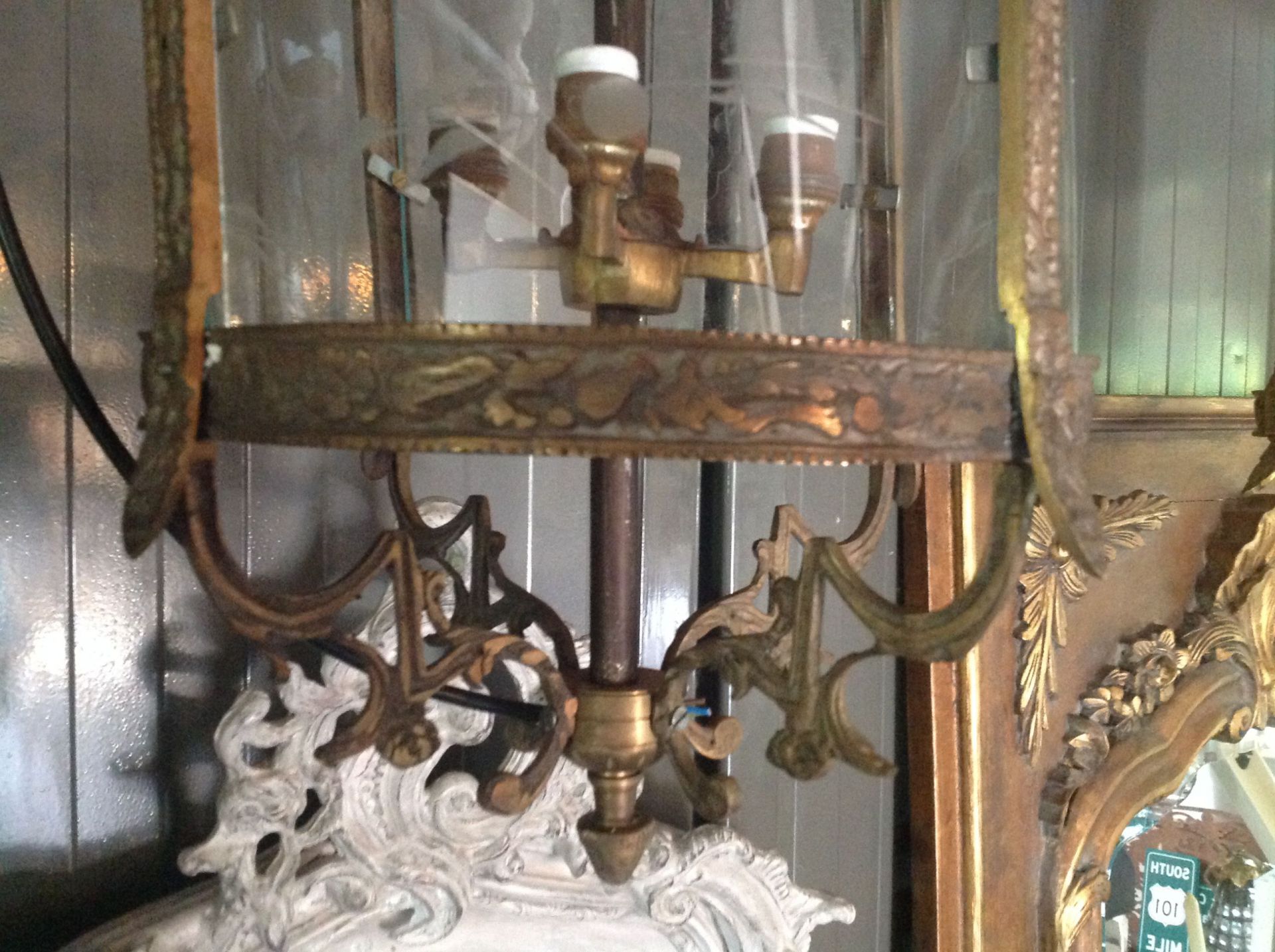 Kopie antieke messing hanglamp met geslepen en rond glas.