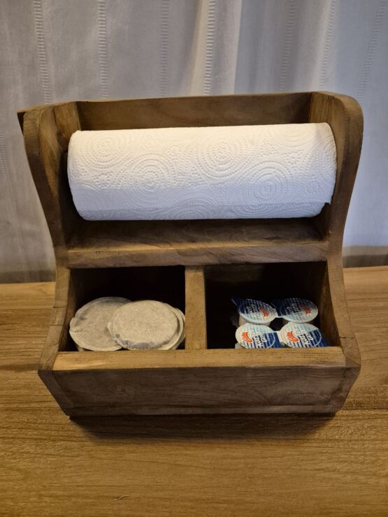 Keukenrol houder met grutterbak teakhout. quantity