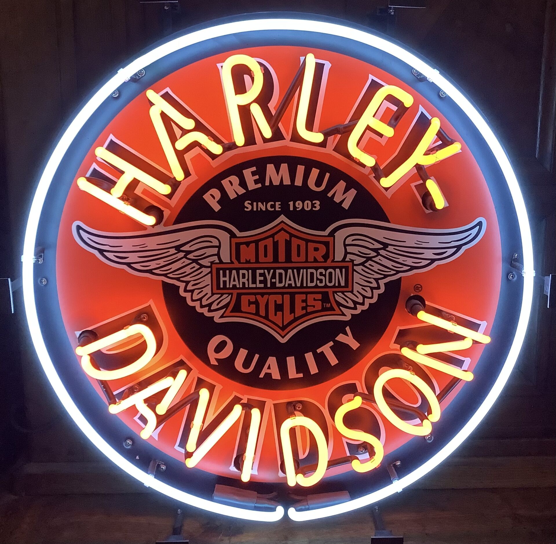 De neon harley is een nieuw model met diner. De neon bestaat uit glas welke middels schok-absorberende steuntjes op een zwart metalen frame zijn gemonteerd. De verbindingen en bedrading zijn mooi weggewerkt.