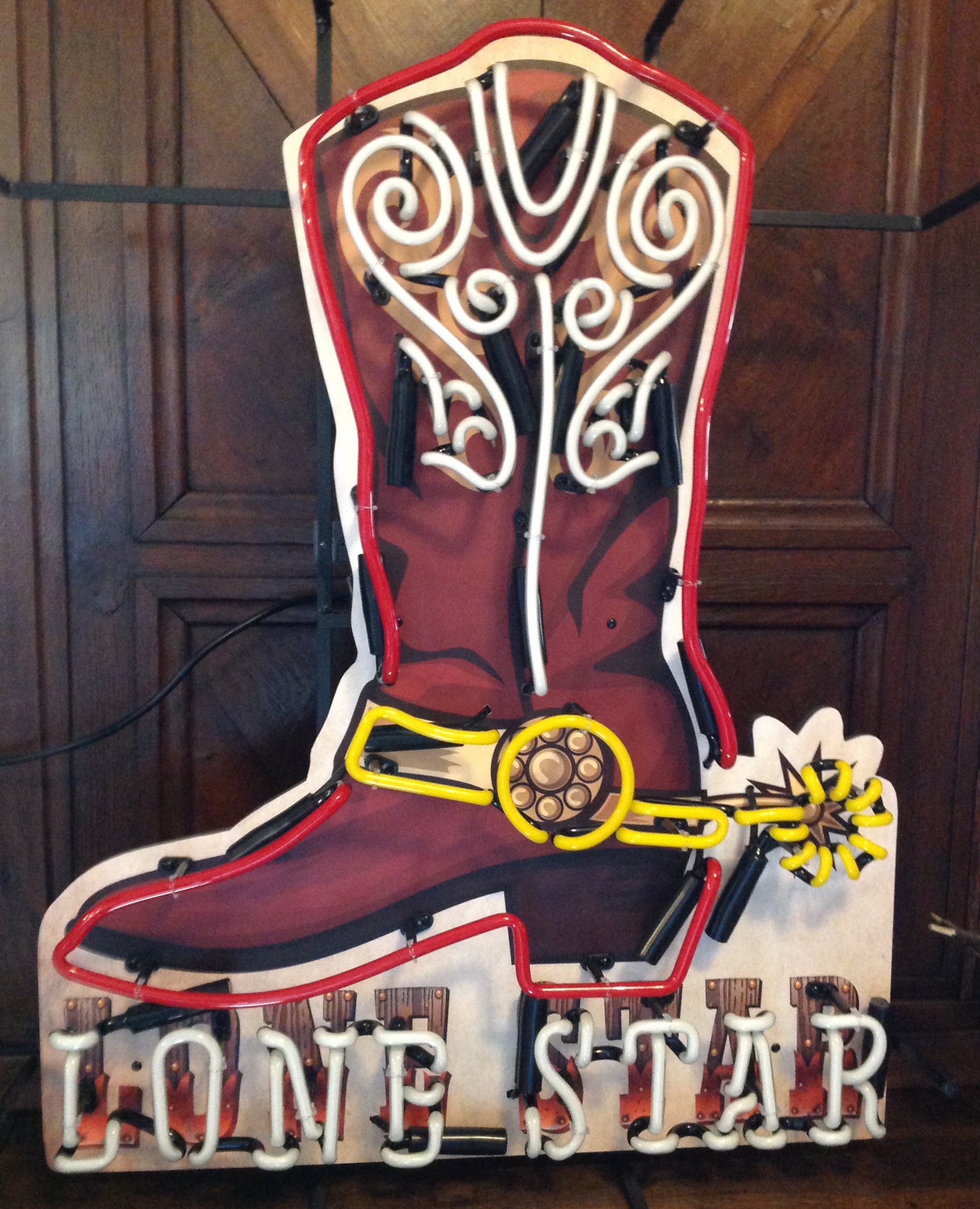Nieuw model neonverlichting lone star. De neon bestaat uit glas welke middels schok-absorberende steuntjes op een zwart metalen frame zijn gemonteerd. De verbindingen en bedrading zijn mooi weggewerkt.