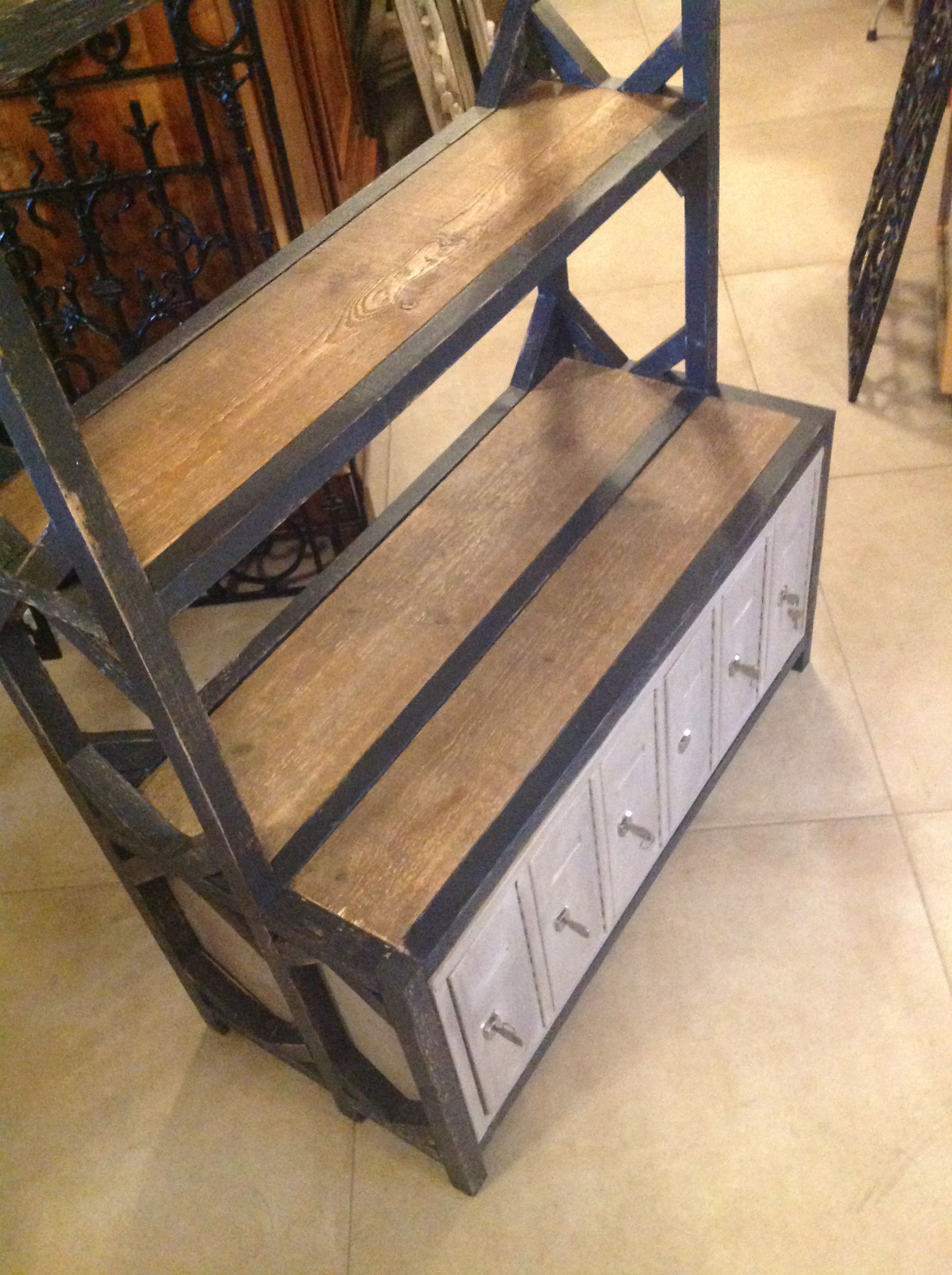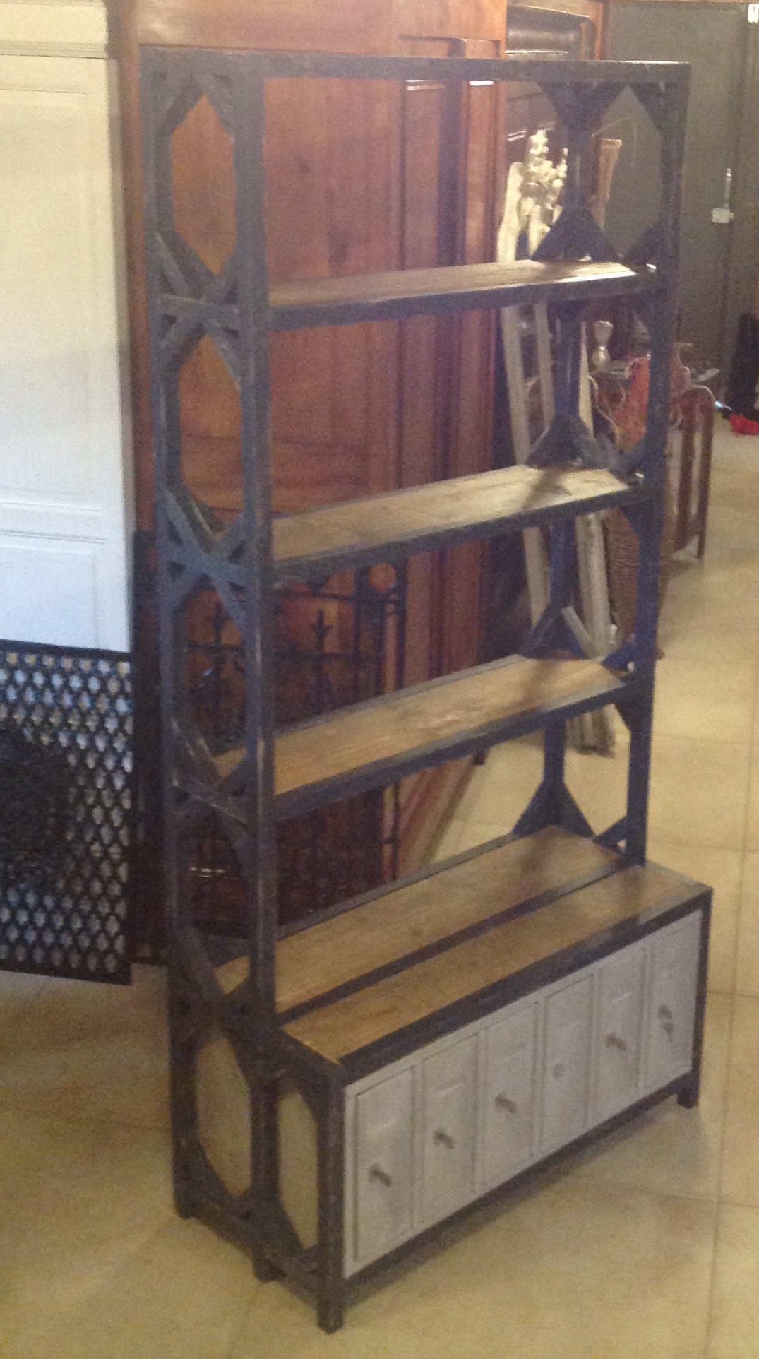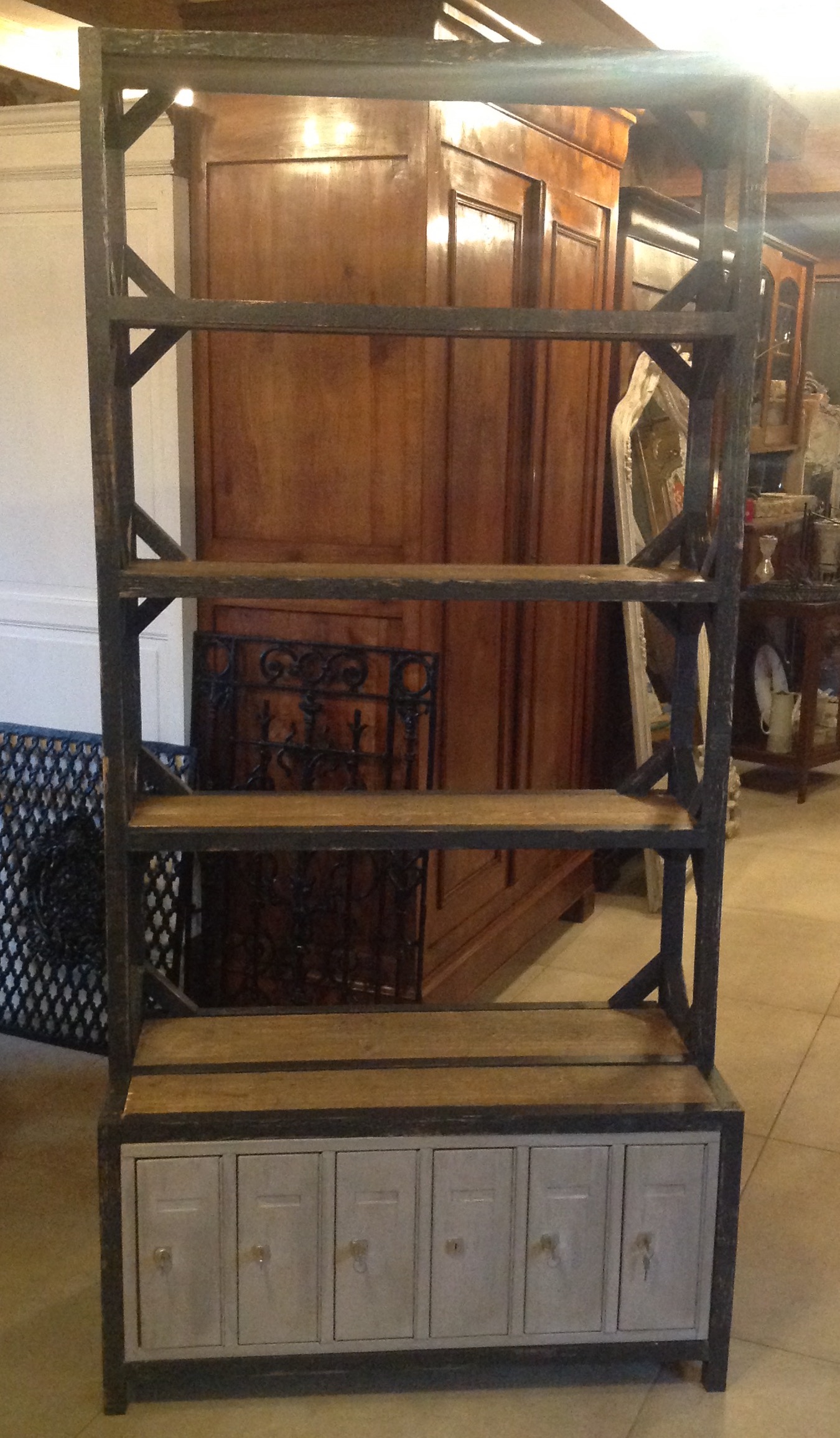 Vintage boekenkast / rek met oude ijzeren lockerkast onderin.